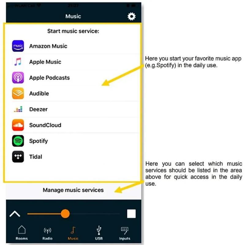 Streaming Directly in the App With the free Almando Play App, you not only get control over your settings but also direct access to a range of popular streaming services such as Spotify, Deezer, Tidal, Qobuz, SoundCloud, Napster, Audible, YouTube Music, and Google Play Music.