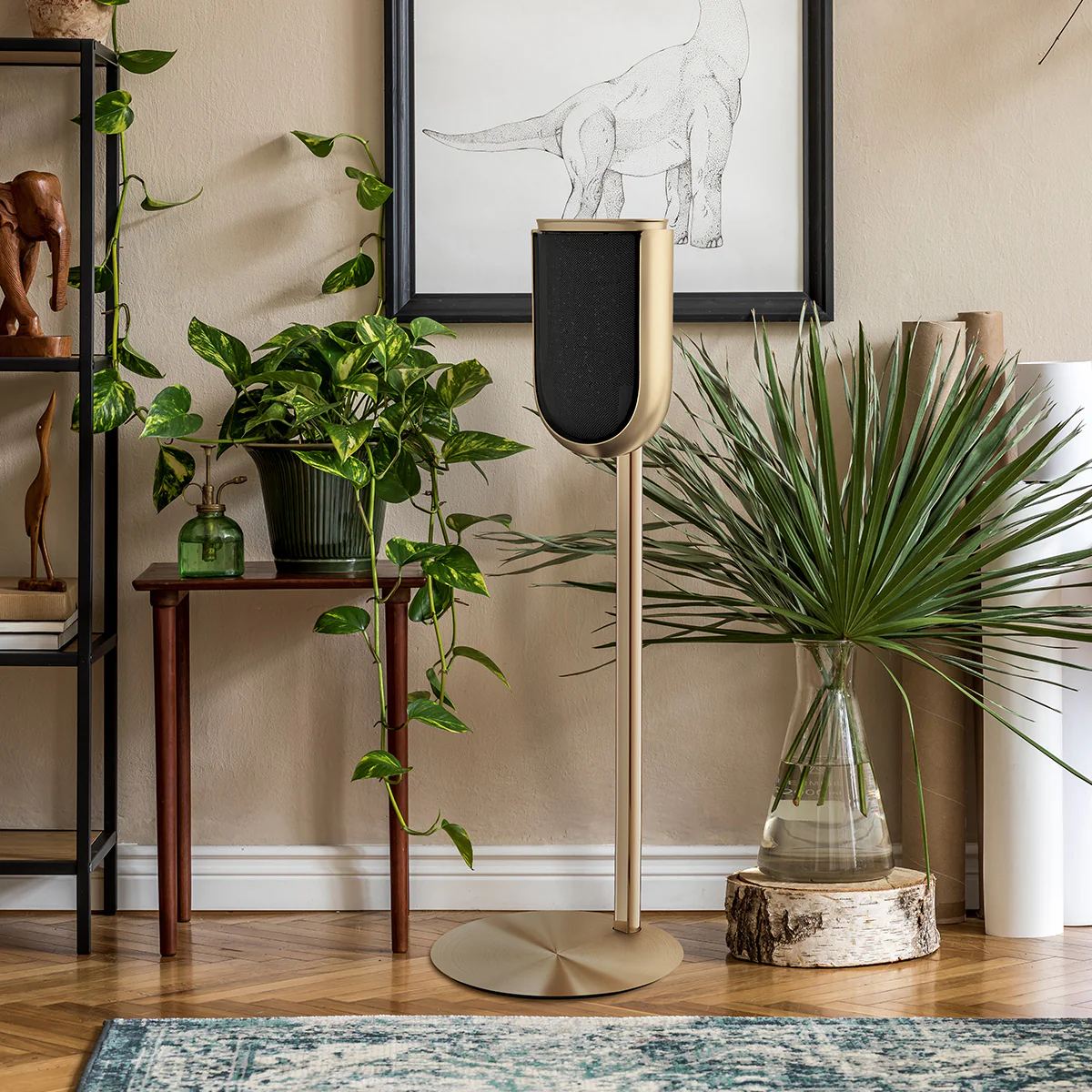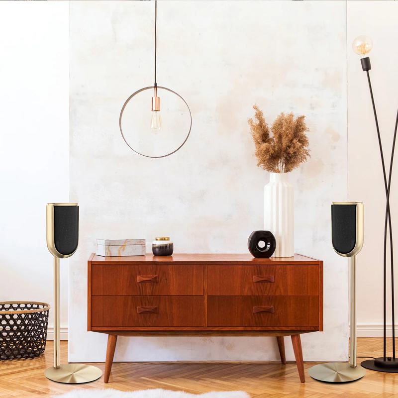 Kultainen BeoLab 8 -lattiateline yhdistää ylellisen muotoilun tarkkaan suunnitteluun. Se on valmistettu ensiluokkaisesta alumiinista ja siinä on upea kultainen viimeistely. Se täydentää kauniisti BeoLab 8 -kaiutinta ja tuo eleganssia ja hienostuneisuutta mihin tahansa tilaan. Teline ei ainoastaan paranna kaiuttimen estetiikkaa, vaan varmistaa myös vakauden ja optimaalisen äänentoiston.